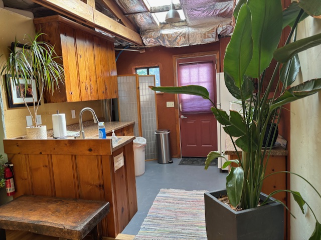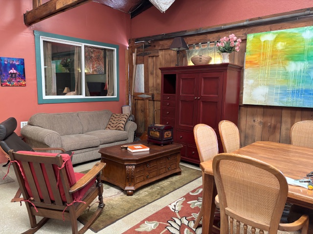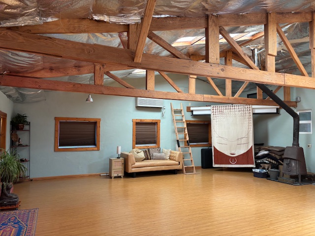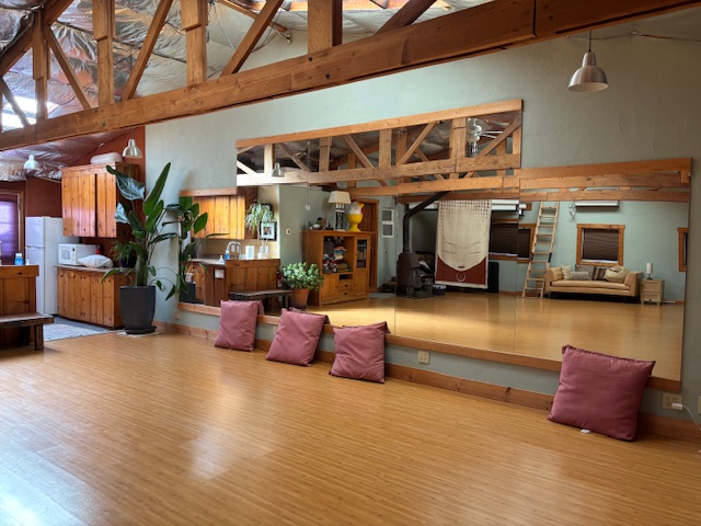 The yoga studio is ideal for workshops, movement classes or an add-on to the adjacent Family Annex. Equipped with a small kitchen, refrigerator, dishes, silverware, air fryer oven and an outdoor propane barbeque. The yoga studio can come with couches for your enjoyment or empty so you can spread out for classes or movement exercises.