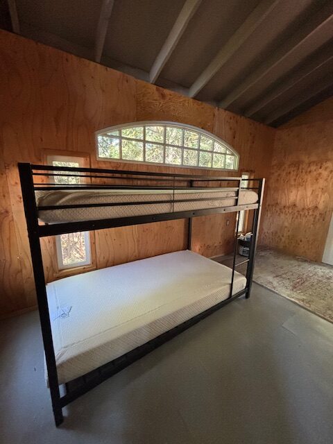 Directly adjacent to the Lodge is our Family Annex that sleeps up to 12 people in a group environment. The Annex offers a private room with a queen bed and a favorite for the young and agile, The Treehouse that offers a full-size mattress pad (linens not provided). In the main living room area are two bunkbeds, queen on the bottom and twin on the top. Also available is a sleeper sofa, a table and chairs and a sitting area for six or more. A bathroom with a private shower, toilet and community sink is available for use. No cooking facilities are available unless you rent the lodge or Yoga Studio.
