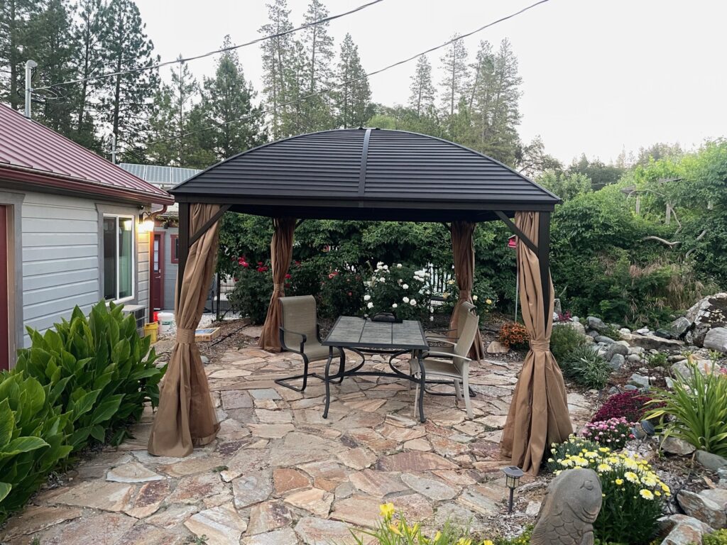 This yurt nestled under the trees for a shady hot day has a full-size bed and a queen sofa sleeper, table and chairs and an amour for hanging your clothes. Electricity is limited. So, no AC, just the cool air floor and auxiliary fans. Guests also have full use of the community kitchen and bathhouse.
